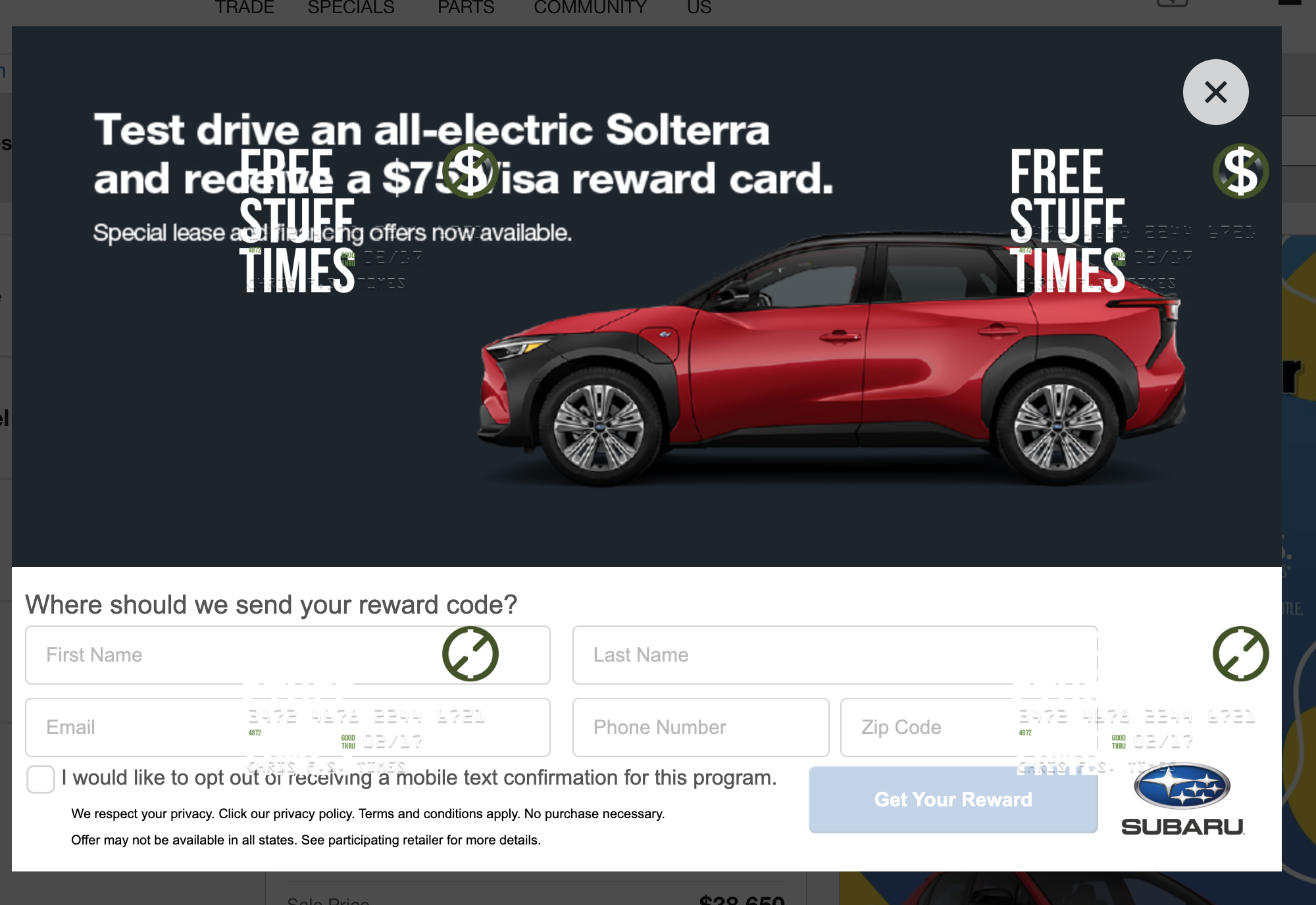 https://www.subaru.com/find/a-retailer.html? -find a local Subaru dealer near you and click the visit website button. Then scroll to their “shop by model” section and select the solterra. If you select a car or scroll around a box should pop up that looks like this. Fill out the form, and get a code at the dealership to get your free $75 Visa card. It might take a few dealers or cars to find the offer box, and your offer may vary.