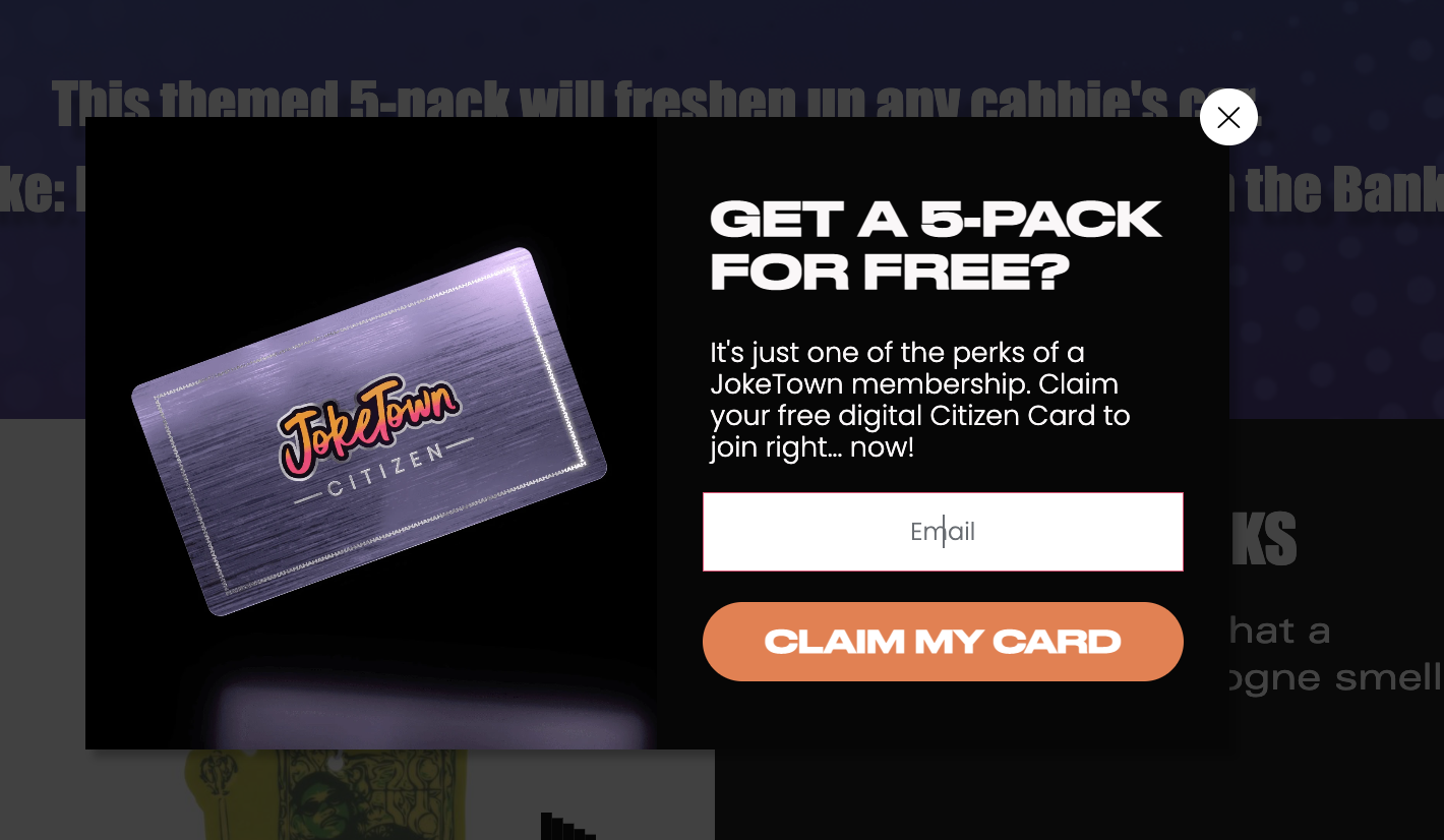 https://www.joketown.com/smellz90s -wait for the box (that looks like this) to pop up and enter your email. Then scan the QR code on that page, and click claim offer. Download the Zelus app to claim the NFT. Some time after that, you’ll get an email that says “You’re a Citizen Now”. Click the link in that email to get the air fresheners free with free shipping. It might take a while for the email to show up.