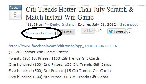 I have a new feature to announce for the Contests section of the site today. It will allow you to mark the contests that you’ve entered with one click, so that you know in the future that you’ve already entered that contest. To use this feature, you must login or register here and you’re ready to go. Once you’ve enterered the contest click the “Mark as Entered” link that is circled below and it will change to “Mark as Not Entered”. If you want to change it back just click that link again. It will always stay marked no matter where you’re using the site as long as you’re logged in. You won’t see this feature when you’re not logged in. If you have any questions feel free to ask in the comments, thanks! Thanks to Christina for suggesting the idea to me 🙂