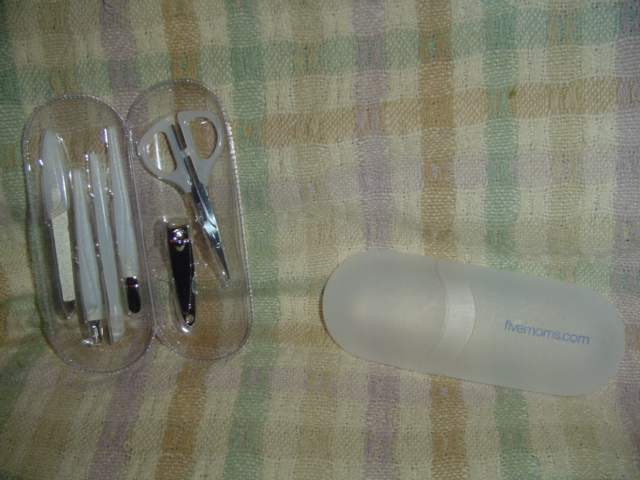 I recieved my 5 moms manicure set today! it came in a carrying case and it had a pair of nail clippers, a nail file,scissors,a weird thing, and 2 cuticle pusher thingies.:) Thanks!