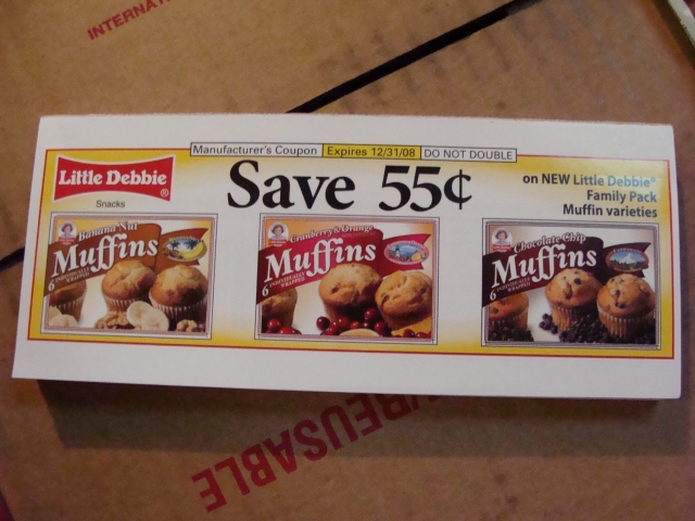 The muffin coupons came today, after I wrote to the lady at McKee foods and told her there were none in my box of muffins. There are about 100 coupons on the pad. If I had know a second box of muffins was coming, I wouldn’t have squeeked about the coupons!