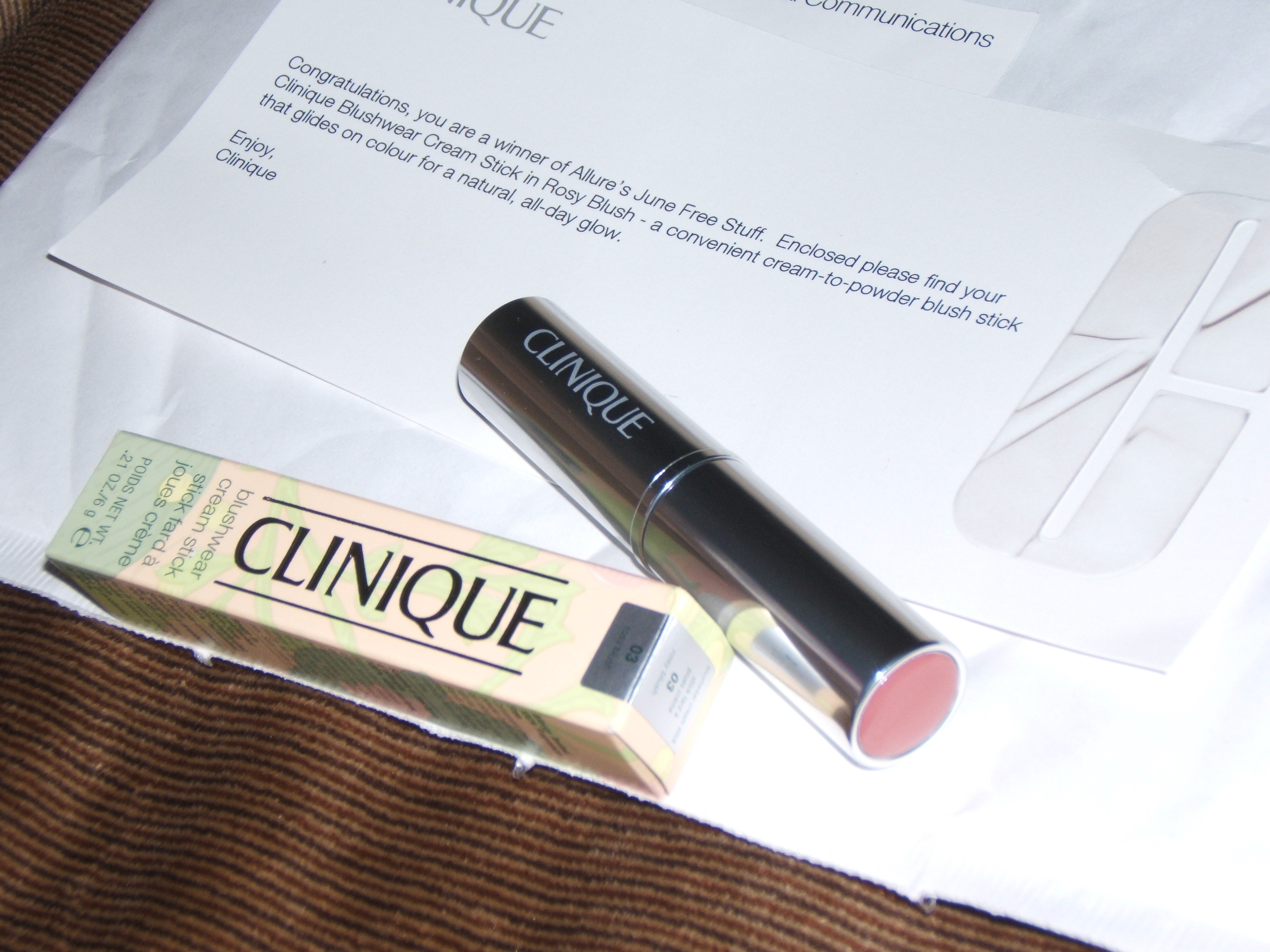 This arrived today, it’s a CLINIQUE Blushwear Cream Stick in Rosy Blush color. (Very Nice) I love makeup!