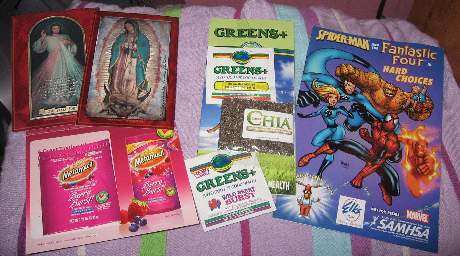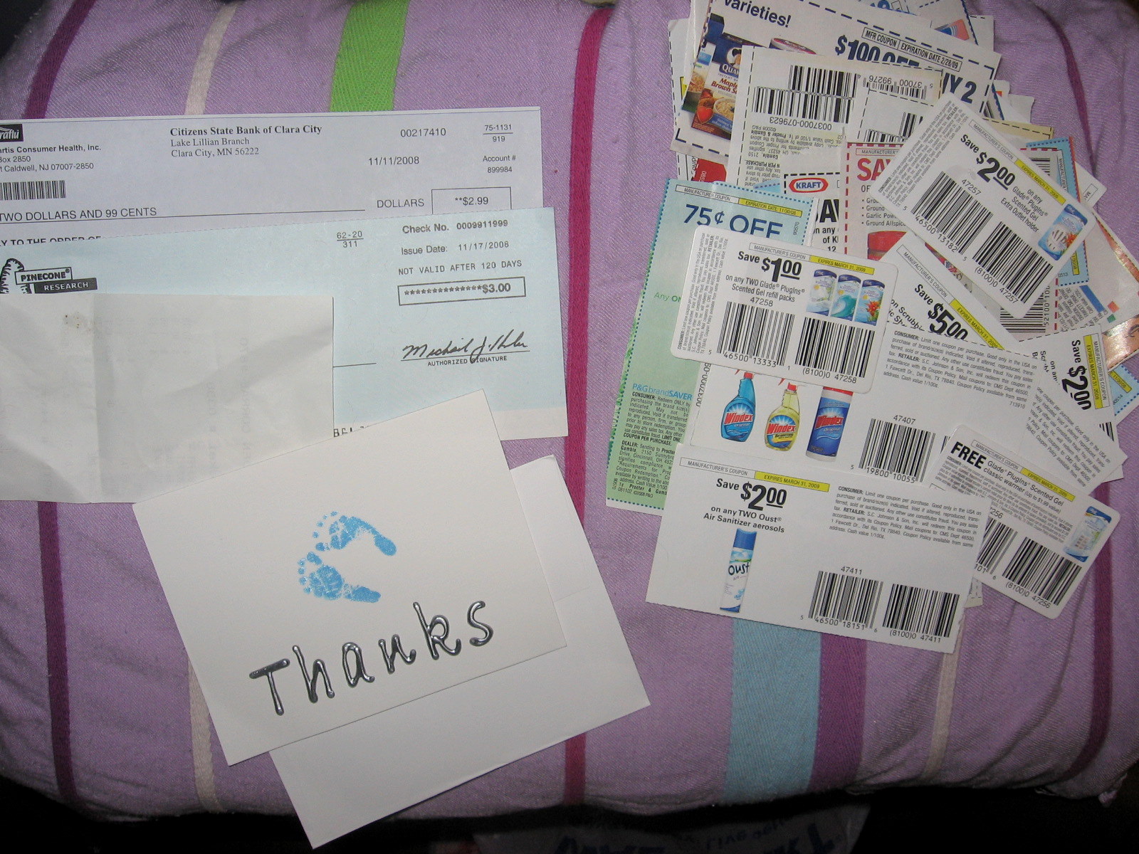 Pinecone check, theraflu rebate, coupons from a friend the card is from Stowers Swaddlers…couldn’t find the post…