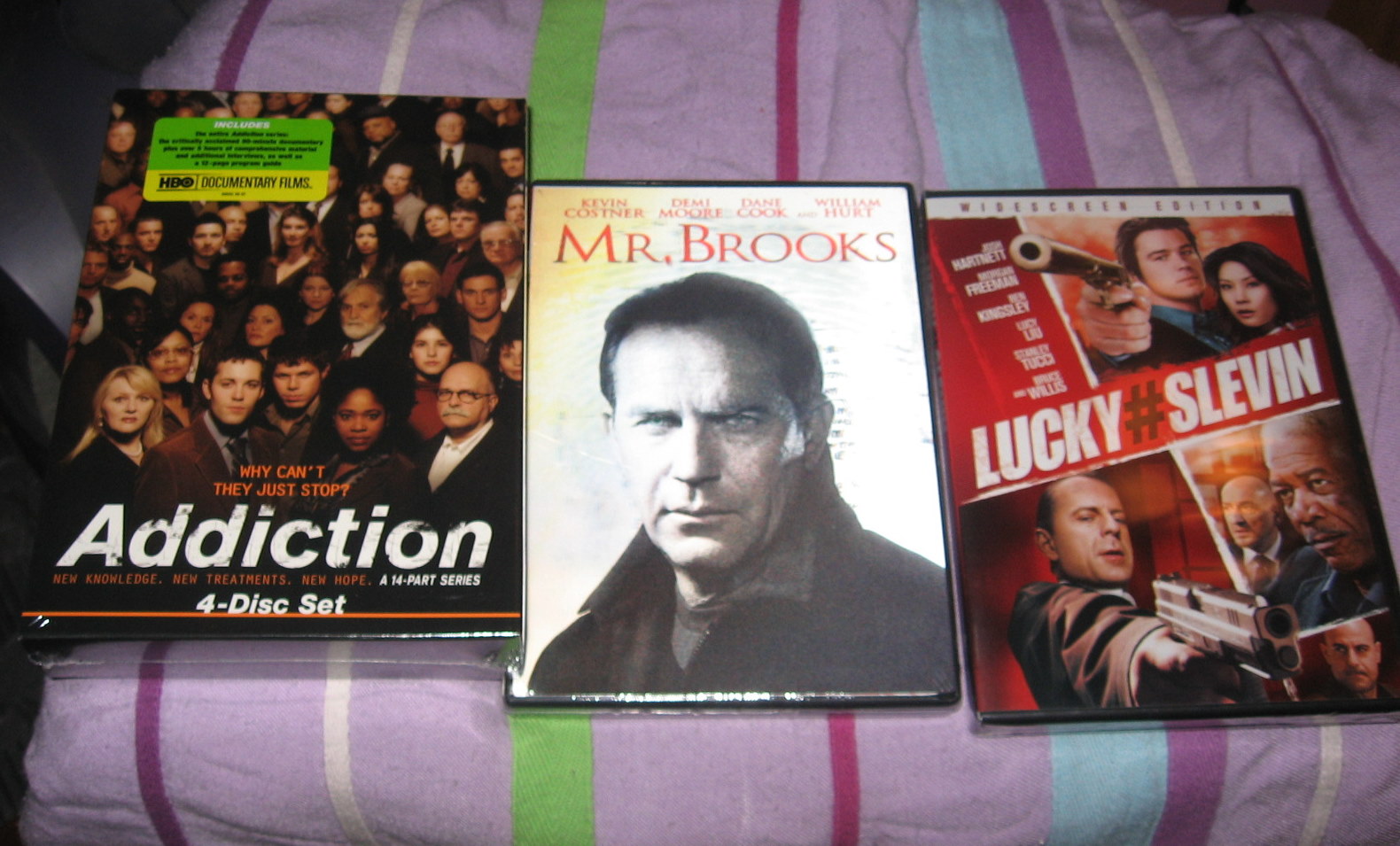 DVDS MrBrooks & Lucky Number SLevin are from PepsiPoints. The Addiction Dvd set is from http://www.jointogether.org/dvd/