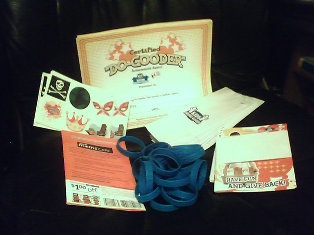 It has a tshirt, 20 bracelet, 20 certificates, 20 lil baggies, and 20 temporary tattoos. I am going to let my lil girl keep the shirt ( I got her size so she can sleep in it) and I am sending in the rest of it to my 4th graders teacher so she can use it. I put 2 pics in this, not for sure if they both showed up