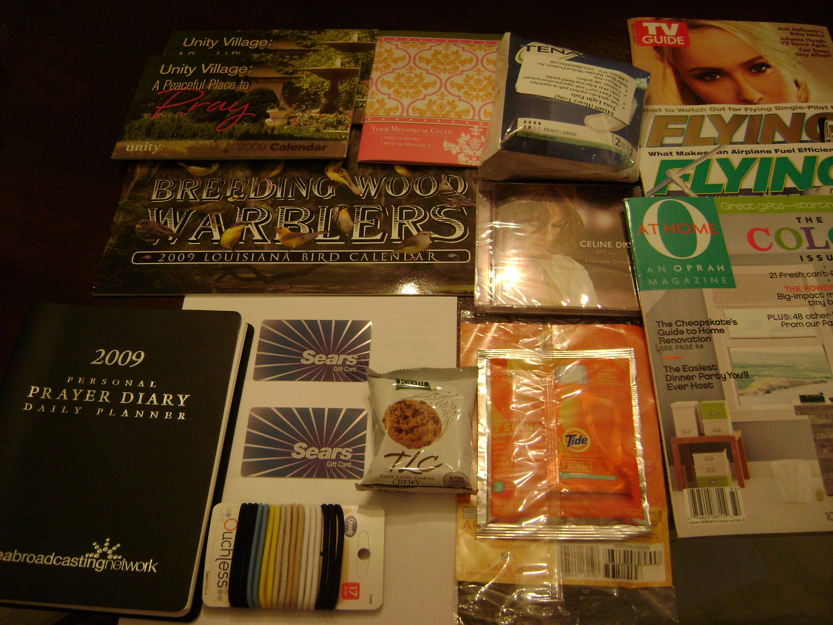 2 Sears $5 GC, Goody’s Ouchless, Kashi cookie, Celine CD won in contest, Tide sample, calendar birds, planner, booklet on mother nature cycle, Adult diaper & magazines.