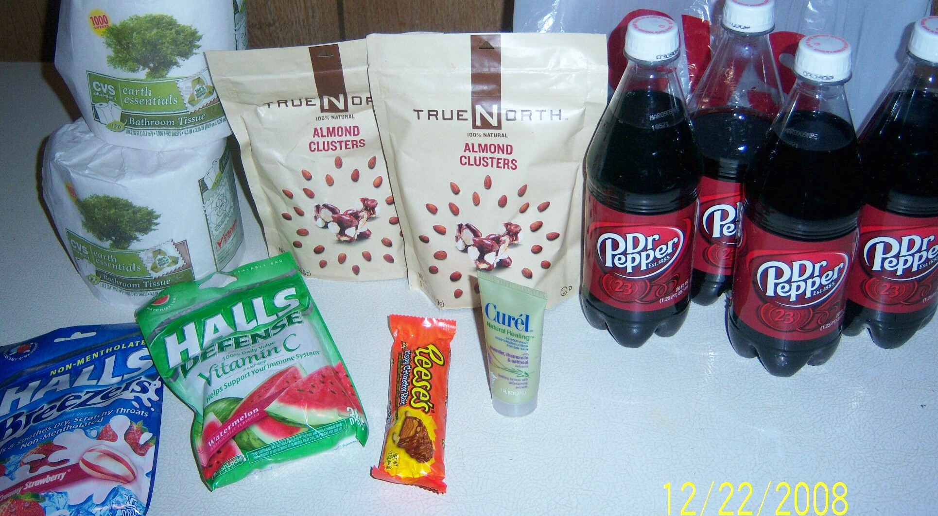 The 4 Dr. Peppers, 1 Halls cough drops, and Curel lotion were free beforehand because of coupons…
