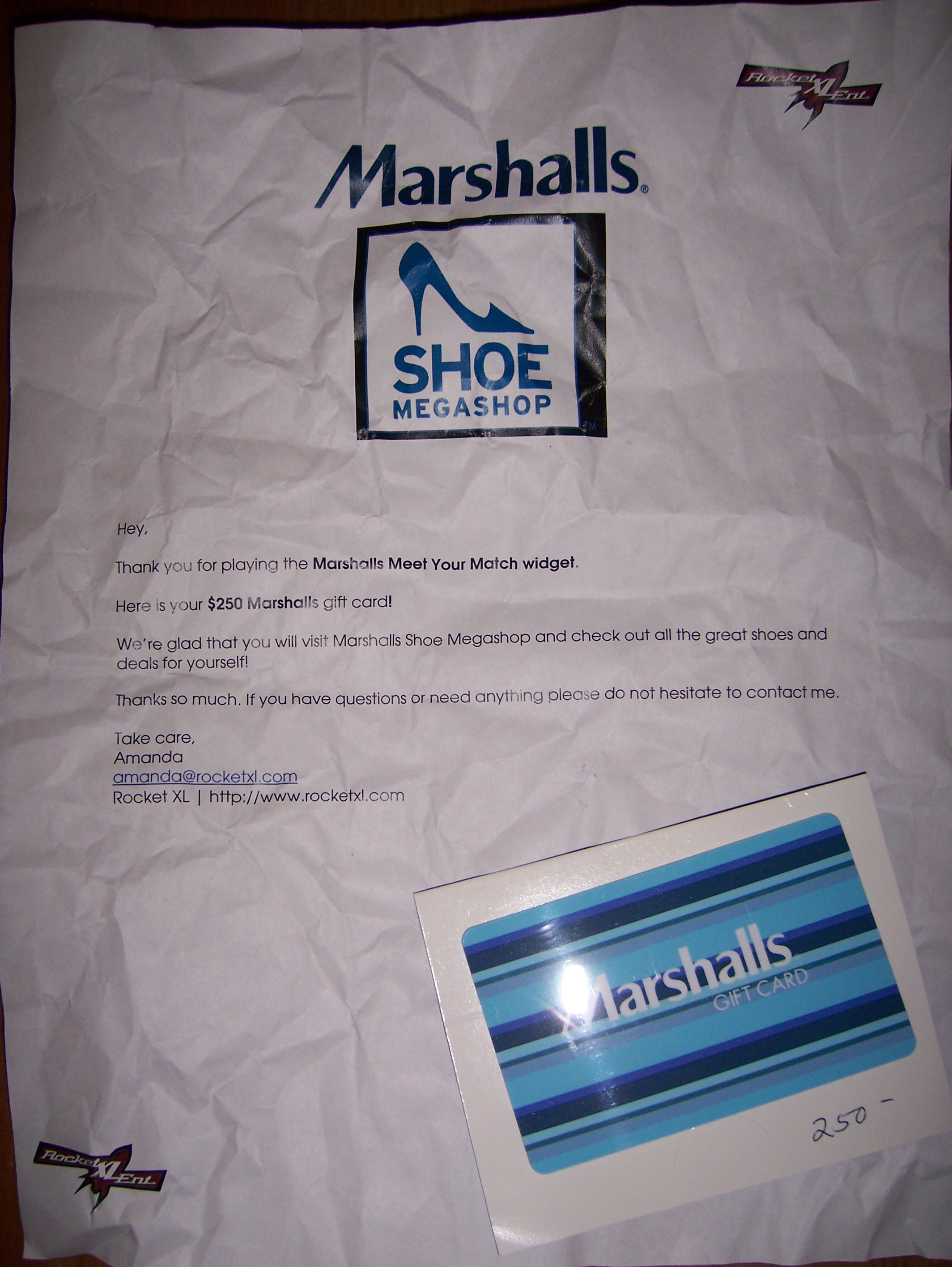 Then the other day I got an e-mail from the same company I won the first GC from saying I won another $250 GC…strange. Again, from Marshalls. Different game though. Maybe it was fate! :kekeke: