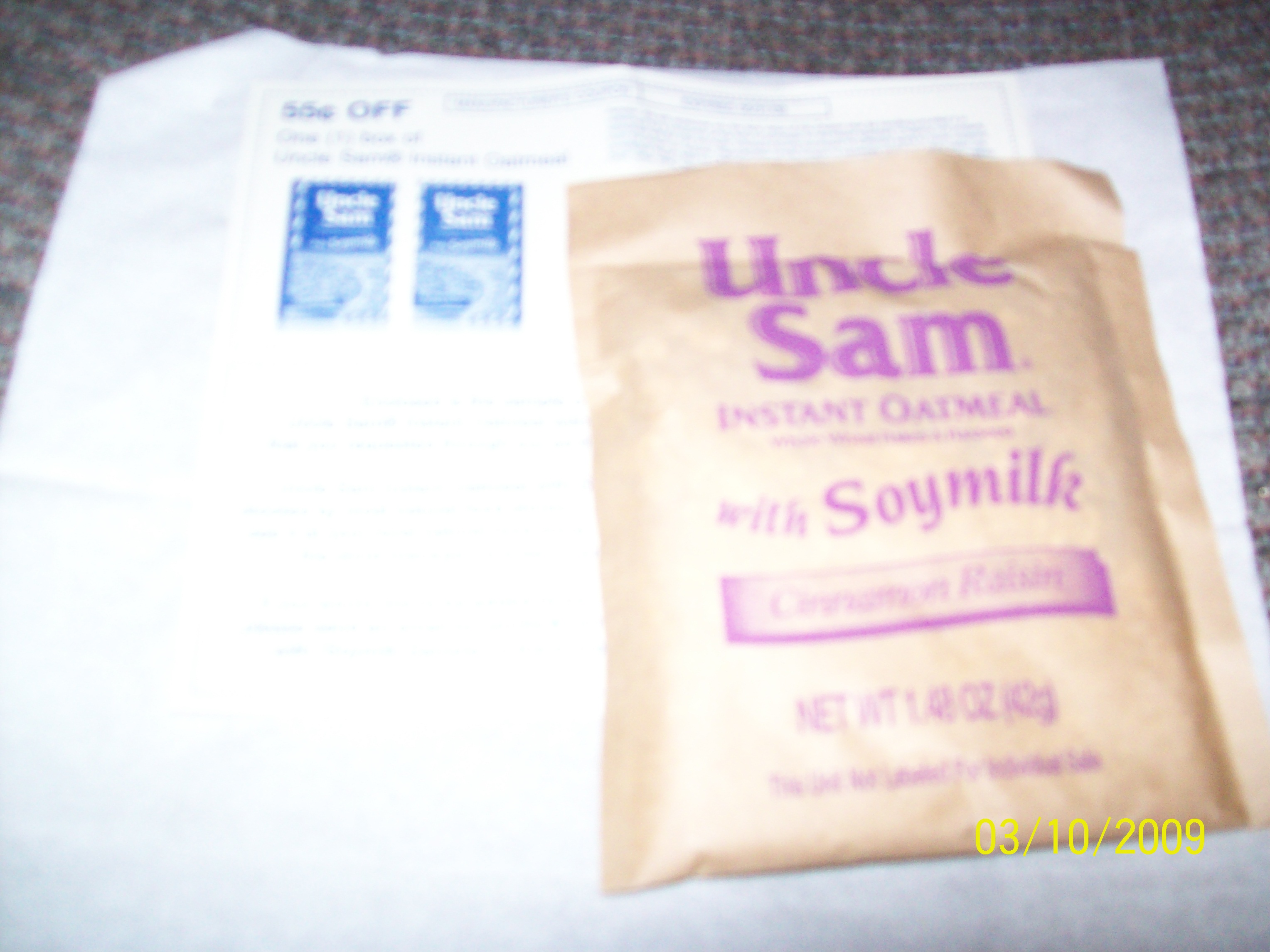 Free sample packet of Uncle Sam Instant Oatmeal with Soymilk-EXPIRED