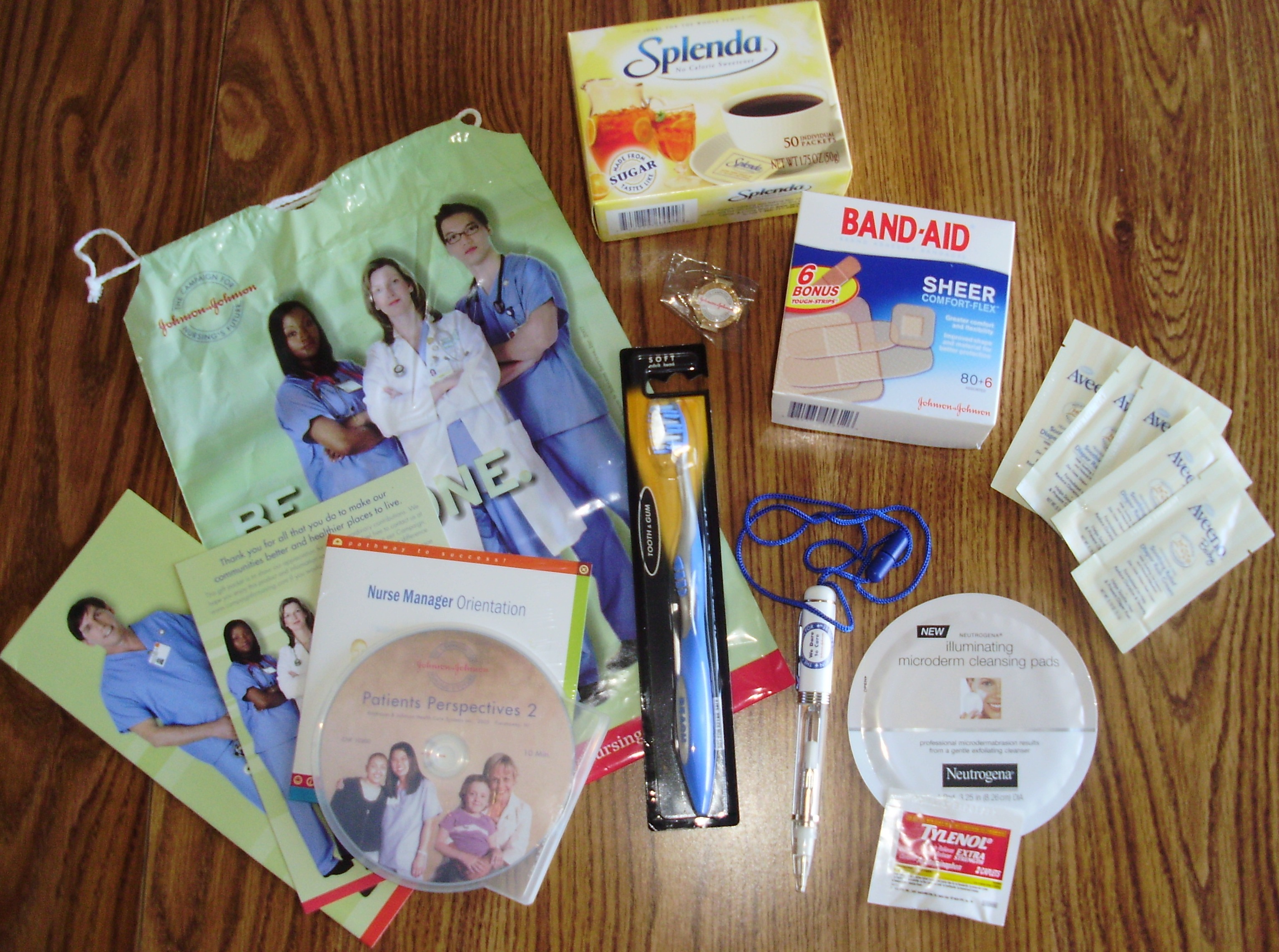 UPS brought this today.. included was a scrub top, brochures, VHS, DVDs, Coloring Books, Toothbrush, Band-aids, Splenda, Aveeno Baby packets, Pen.. It is a very nice package!!