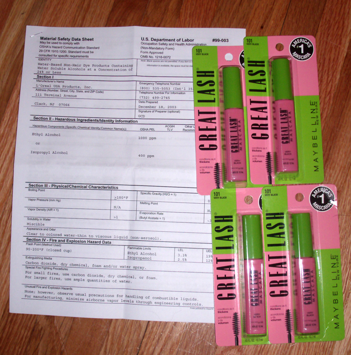 I got a package today by UPS that contained 4 tubes of Maybelline Great Lash mascara. It was from Hearst Magazines and the paper inside says “Material Safety Data Sheet” but the information on that sheet is about L’Oreal. Maybe L’Oreal makes Maybelline? The Data Safety Sheet tells about all the ingredients in the product and any product warnings, etc. I don’t think this sheet goes with the mascara though b/c the Appearance and Color are listed as: “Clear to colored water-thin to viscous liquid (non-aerosol).
