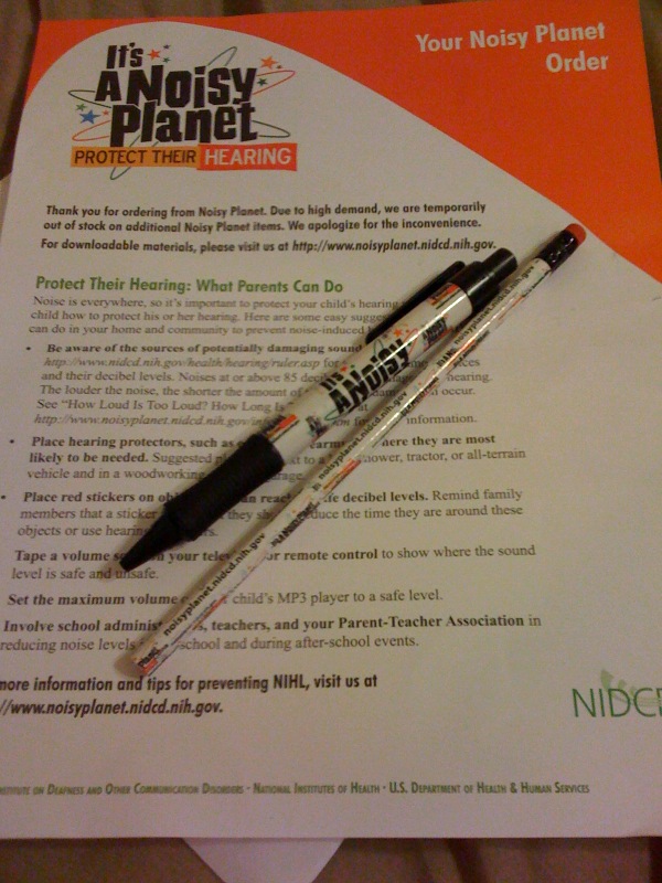 This is from March 20 Original Post : http://knuckeyimports.com/20/free-noisy-planet-pens-pencils-car-magnet-and-posters/ https://www.noisyplanet.nidcd.nih.gov/noisyplanet/templates/orderitems.aspx They are out of stock of a lot as stated in the letter but it was still nice they sent a pen and pencil.