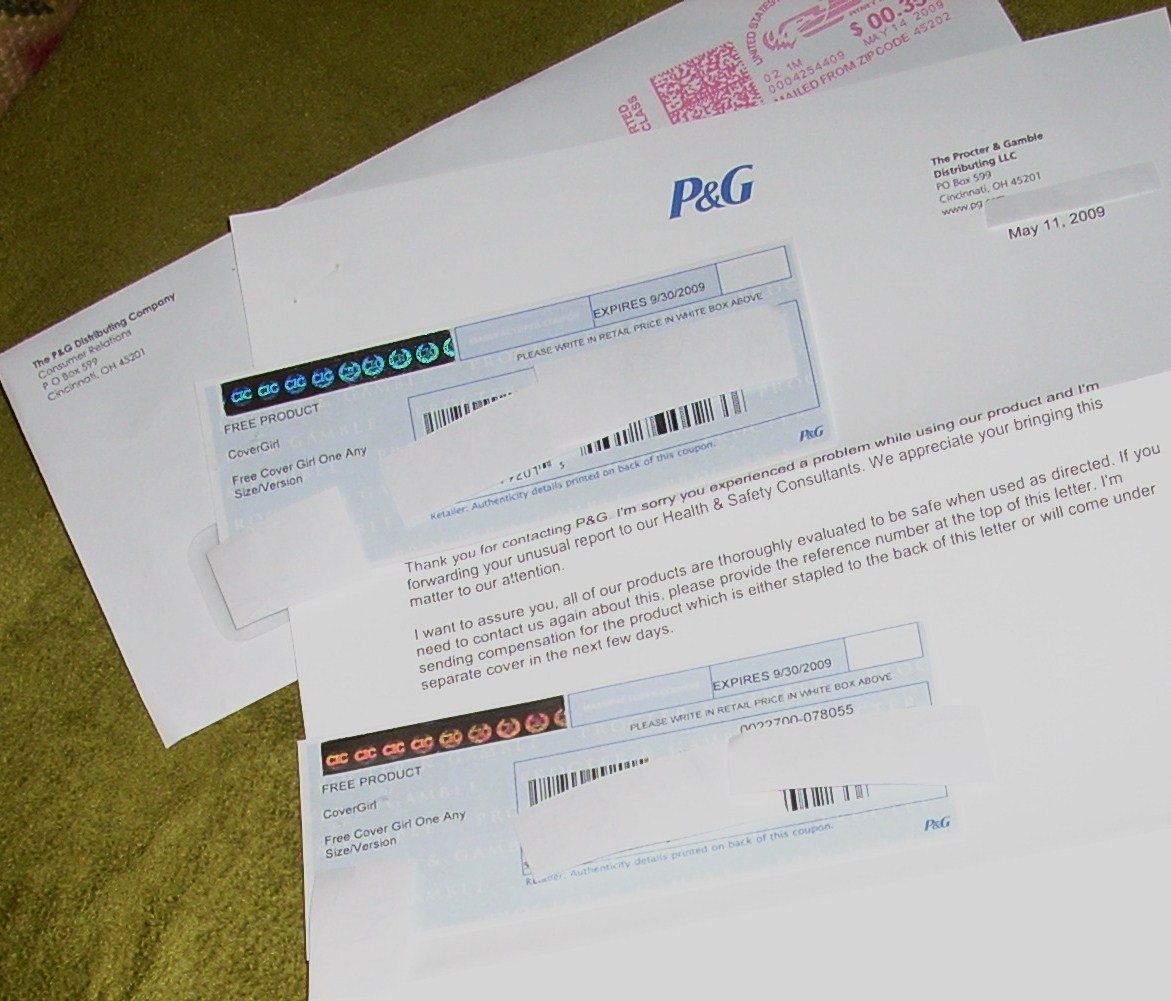 Received these in todays mail. I had a reaction to the Cover Girl with a touch of Olay Simply Ageless foundation. So I gave them a call to let them know, in return they sent me 2 coupons for a FREE PRODUCT. Any size/version. Thank you Cover Girl.