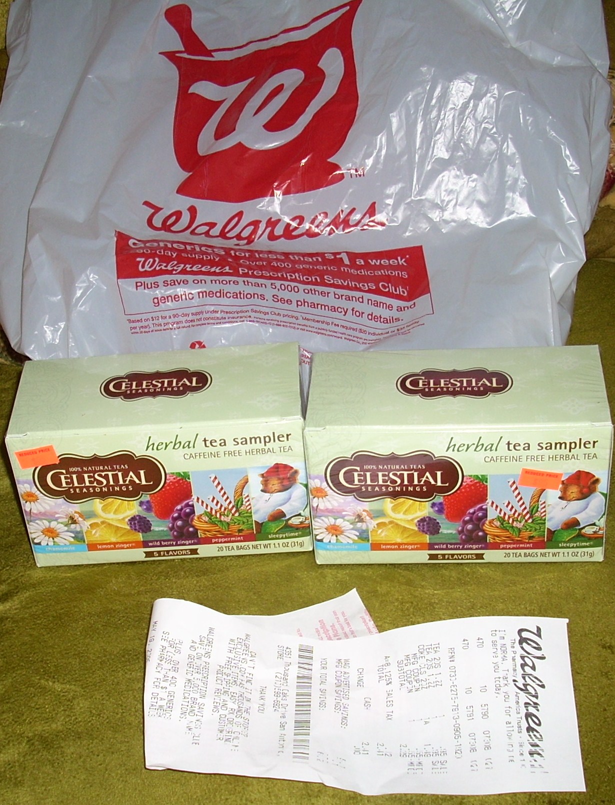 Walgreen’s had these boxes of Celestial Seasonings Herbal Tea Sampler Caffeine Free Herbal Tea on clearance for $0.95 each, I had 2 coupons for $0.55 off the purchase of any Celestial Seasonings tea products. So I got EACH box fo ONLY $0.40! Each box contains 20 tea bags and 5 flavors: Chamomile, Lemon Zinger, Wild Berry Zinger, Peppermint and Sleepytime. What a DEAL!