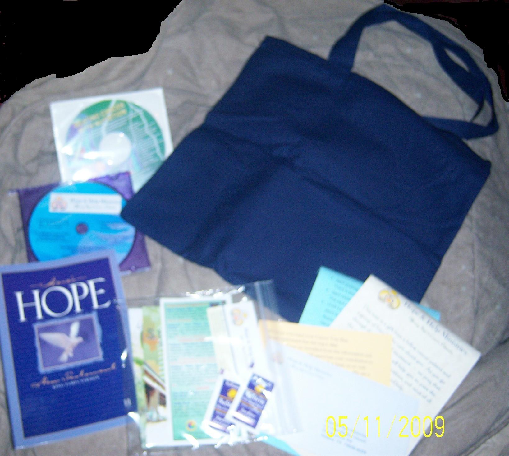 Blue tote bag, Here’s Hope Bible, 2 discs, 2 NuNaturals NuStevia samples, and info