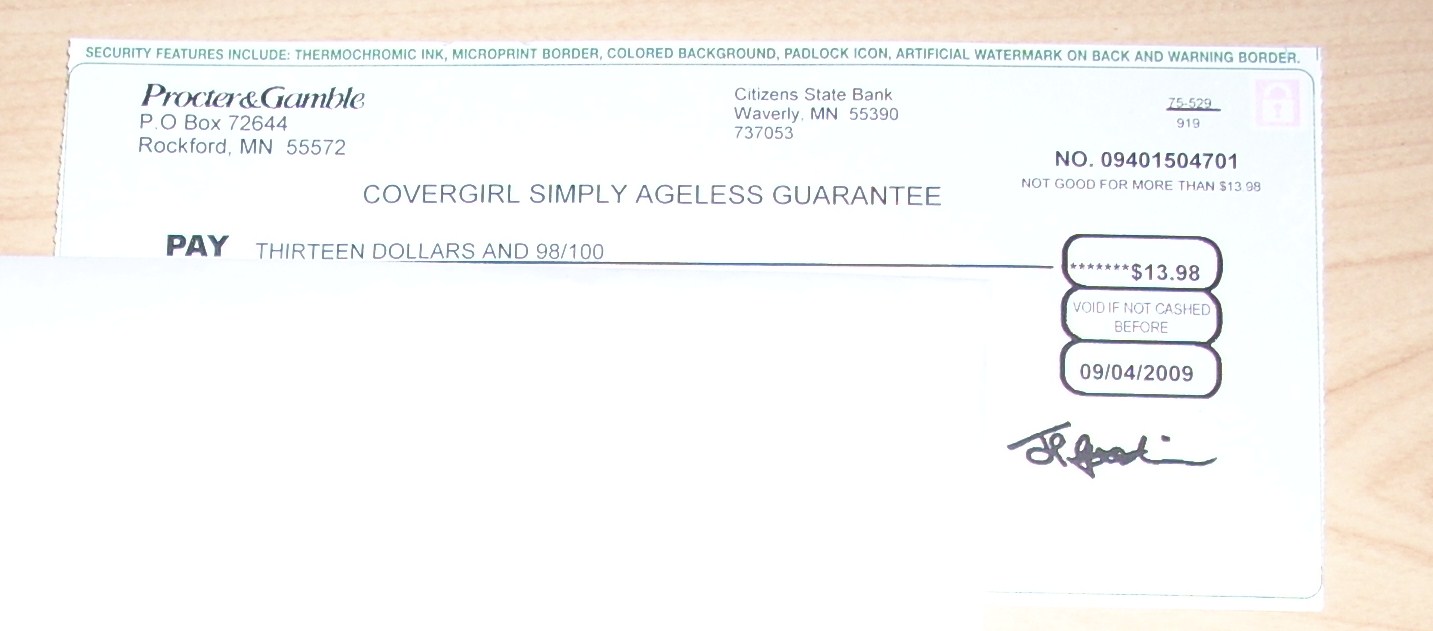 Covergirl Olay Simply Ageless Money Back Guarantee $13.98 Refund Check