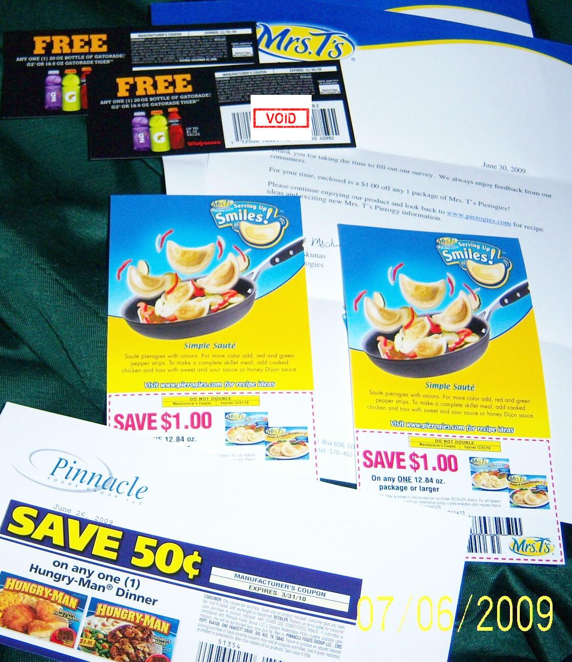 2 Free Bottle Of Gatorade, G2 Or Gatorade Tiger coupons, 2 $1 off Mrs. Ts pierogies, and a 50 cent off Hungry-Man dinner coupon