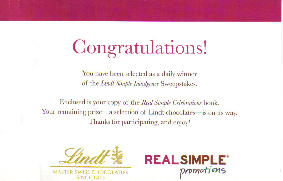 This came by UPS today,I won the Daily Lindt Simple Indulgence Sweeps.Can not wait to taste the chocolates, Great recipes in the book. :h5: