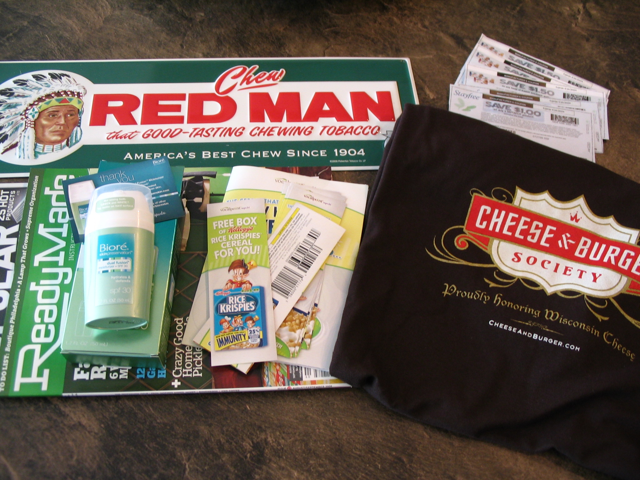 http://knuckeyimports.com/05/free-pouch-of-red-man-silver-blend-chewing-tabacco/ http://knuckeyimports.com/02/free-cheese-burger-t-shirt/ Biore lotion through facebook, and a bunch of coupons & magazines…