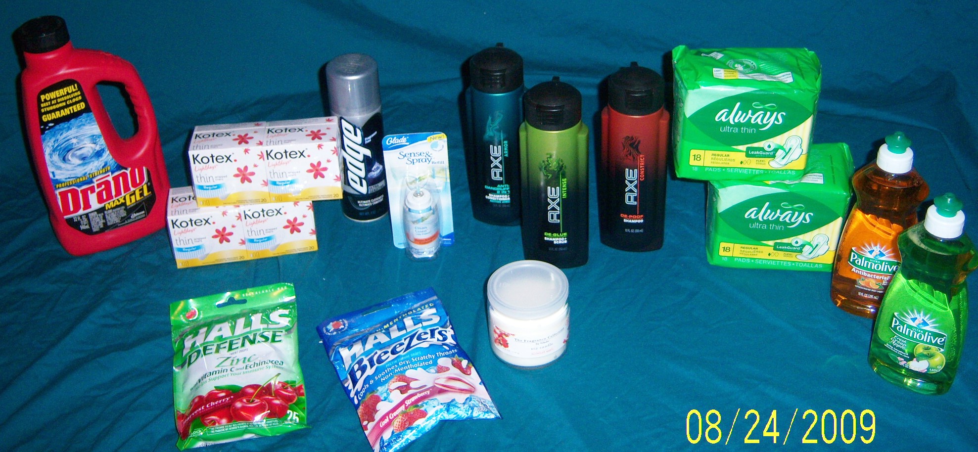 OMG I had soooo many free product coupons expiring soon. LoL. Most of the coupons have been posted in the past. : *2 Halls cough drops, 2 kotex liners, 2 always pads, 1 Drano, 1 glade sense & spray refill, one 4.9 oz glade mcintosh apple candle (it stinks), 2 palmolive dish soaps, 3 axe shampoo/conditioner products, & 1 edge shave gel*