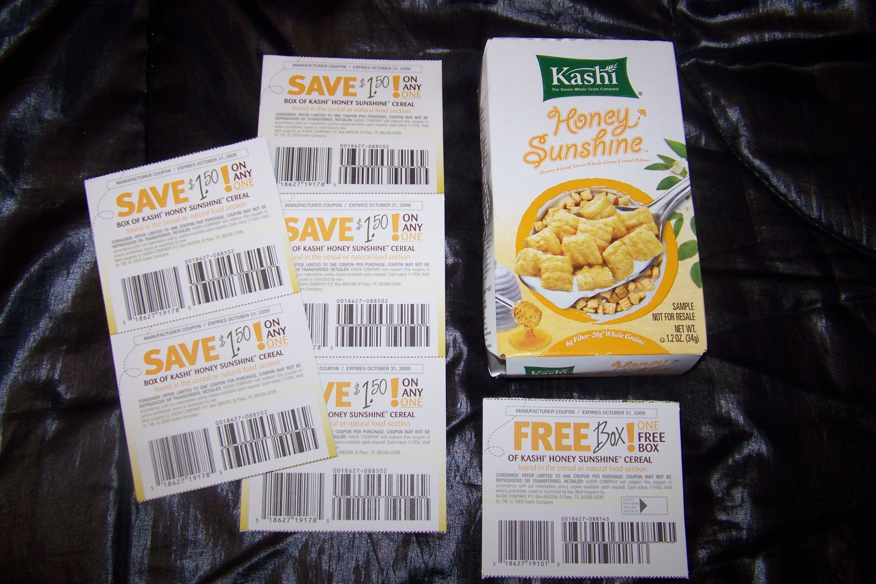 Cereal sample, coupon for a free box, and 5 coupons for $1.50 off a box.