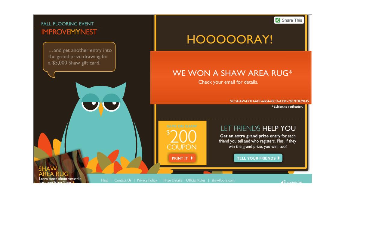 Subject to verification, you’re one of our lucky winners of a Shaw Hemisphere area rug in the Shaw Fall Flooring Event Instant Win & Sweepstakes!