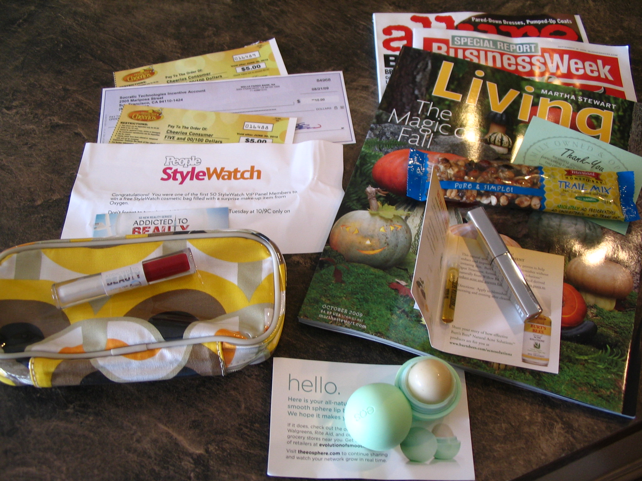 Pretty much the same stuff everyone else got, plus a few checks from Socratic forum and the Cheerios IWG, and a cosmetic bag & lip gloss from the People Stylewatch VIP panel for some Oxygen survey(?)… thanks Chris!