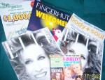 (2) $2 off Purina coupons, From Where I Stand book with bookmark & appt. notepad, and 6 mags