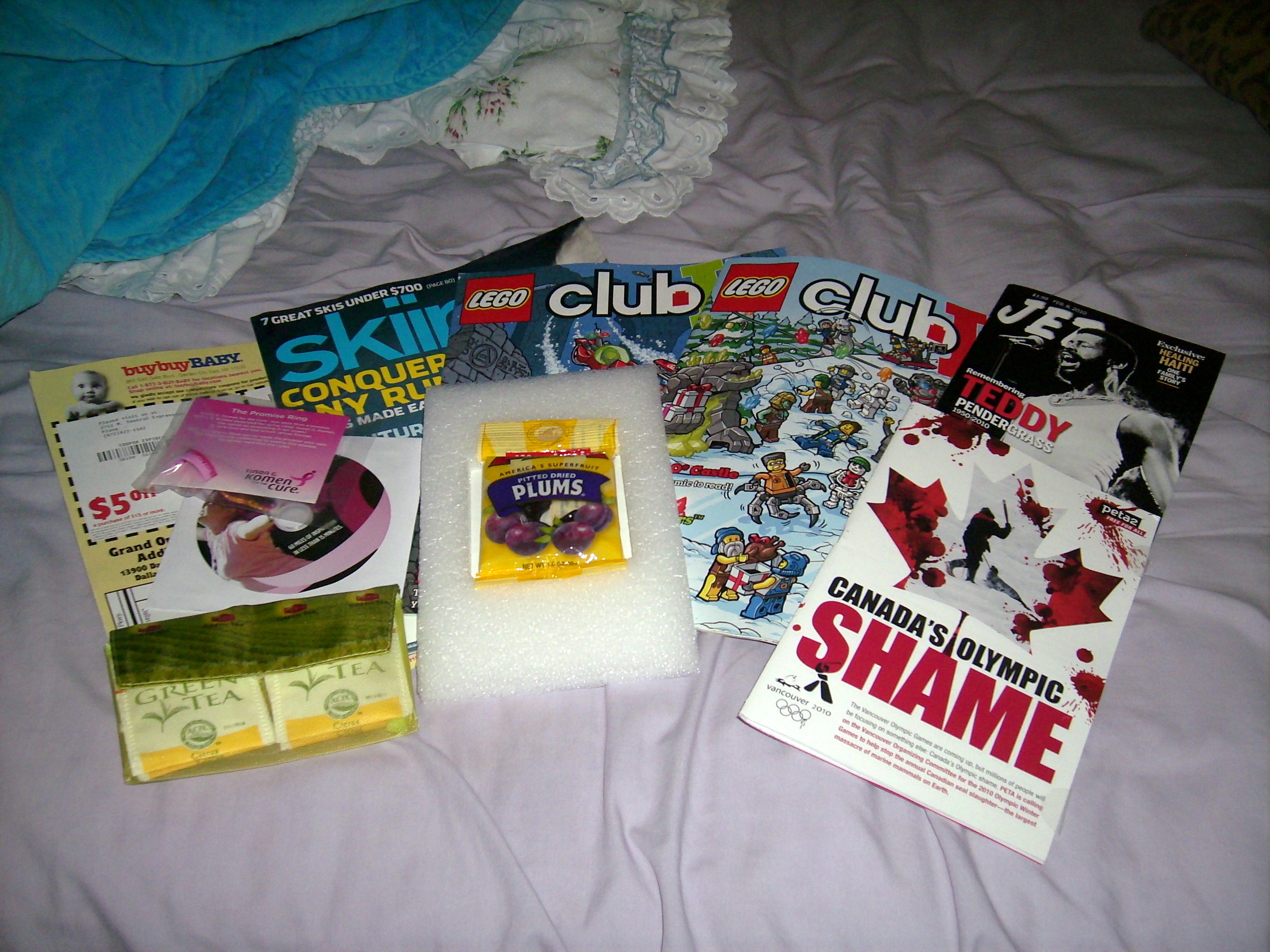 Wow! Is it the 28th ALREADY!? -Lipton Green Tea samples in Citrus –Mariani Dried Plums –JET magazine -PETA2 campaign – Canada’s Olympic Shame -2 LEGO Club Jr. magazines –Skiing magazine -BuyBuyBaby coupons -Breast Cancer ring & DVD