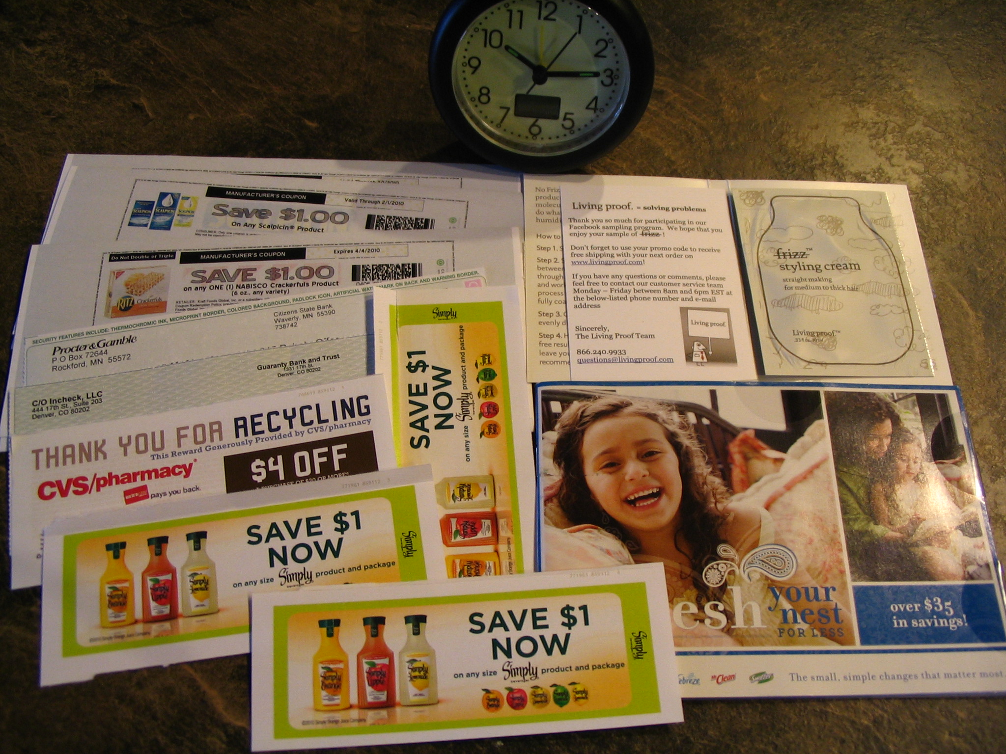 Travel alarm clock (from freebizmag, apparently), Bricks coupons, P&G $15 rebate check for Olay Regenerist, survey check, 4 Recyclebank coupons, Home made Simple coupon booklet, Living Proof no frizz styling cream sample (this stuff is awesome, too bad it’s so expensive!)