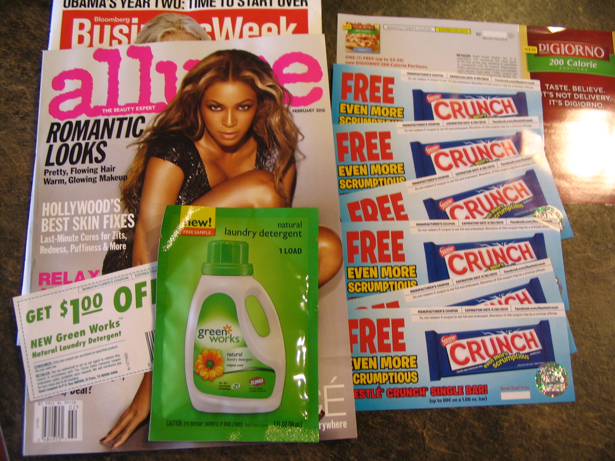 6 Nestle Crunch bar coupons, free Digiorno 200 calorie pizza coupons from Kraft First Taste, Green Works laundry detergent sample + q. Thanks Chris!