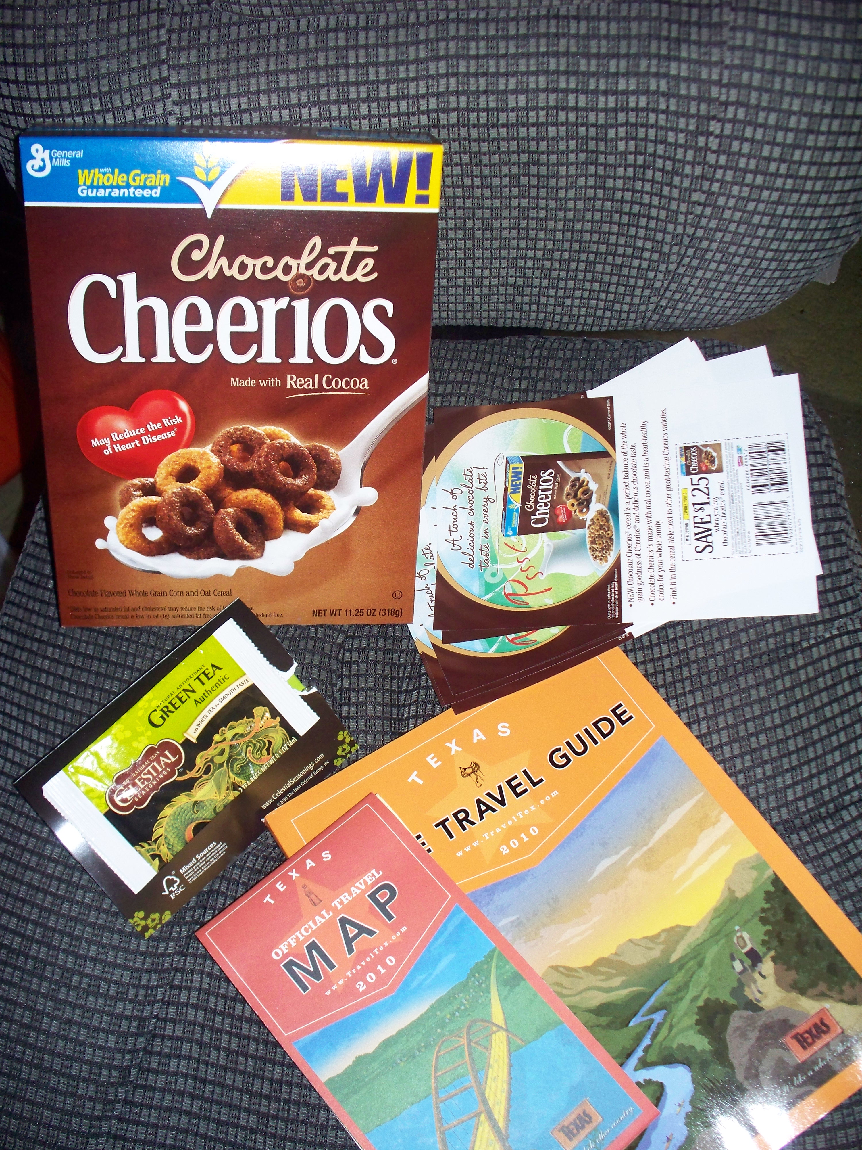 Chocolate cheerios and coupons from Psssst, Celestial seasoning tea sample from facebook, and a map of Texas with a travel guide( not sure where this one came form, but my 4 year old is playing weatherman with the map).