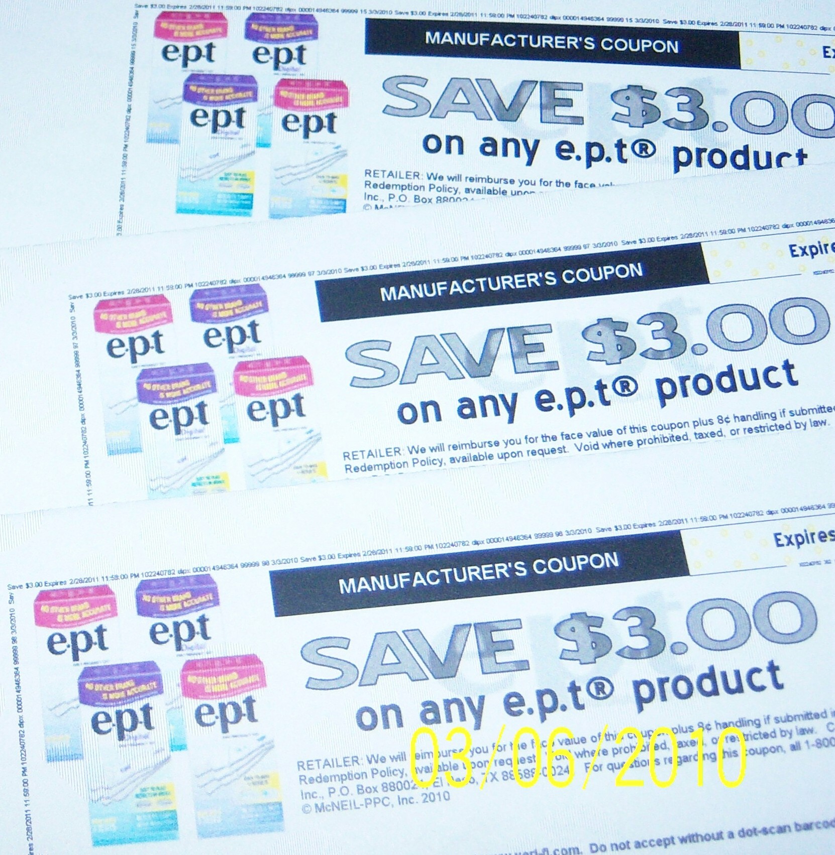 Three $3 off any E.P.T. product coupons