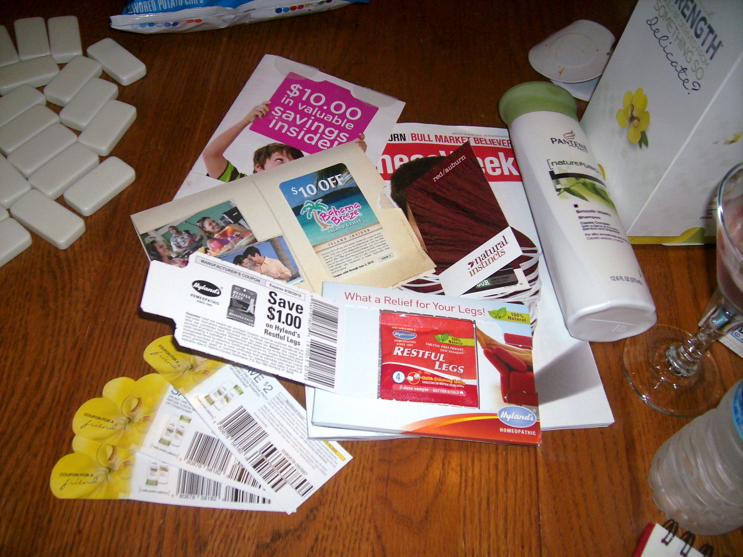 plastic pouch, coupons, pamphlets, 2 samples