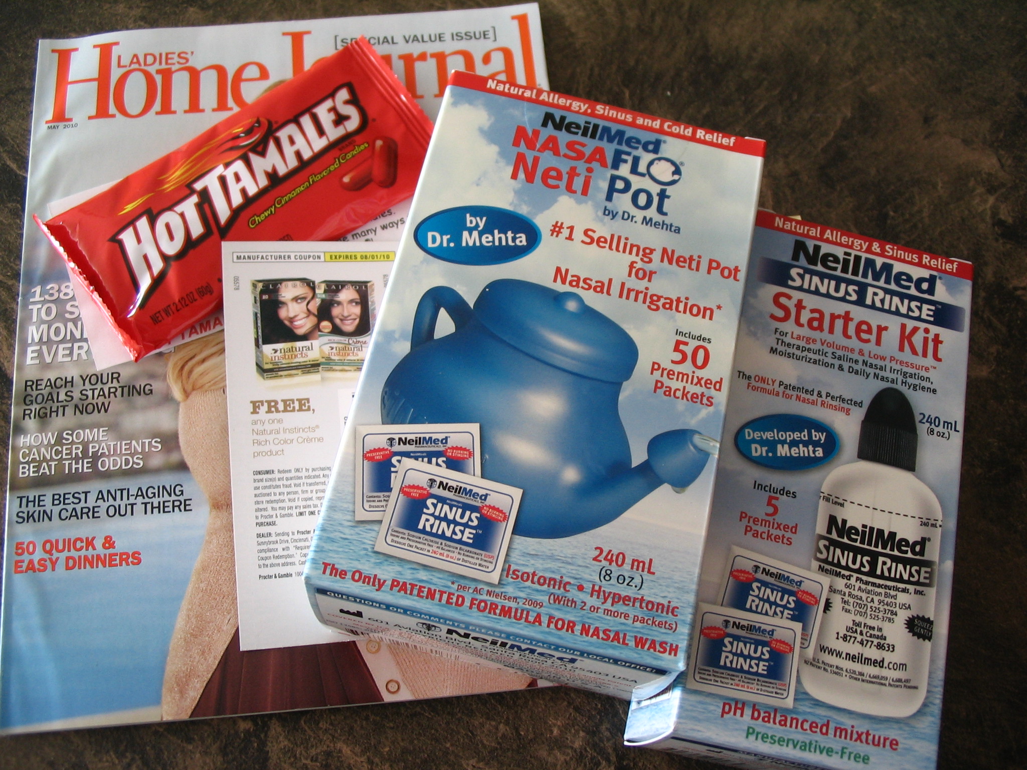 Got the Neti Pot and sinus rinse starter kit from NeilMed for hubby, a free Natural Instincts coupon, Hot Tamales candy win, LHJ magazine, & went and got the Moose Munch from Harry and David without any issue, yum! Thanks Chris!