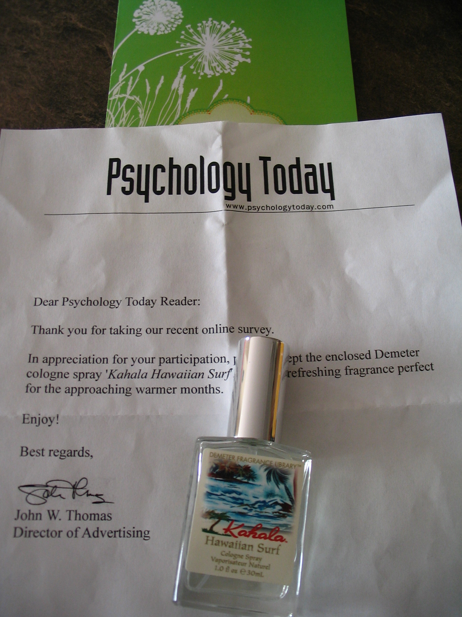 Got a bottle of Demeter “Kahala Hawaiian Surf” from doing a survey for Psychology Today , smells awesome! And a greeting card I made at Fidipidi, love those  :wiggle: