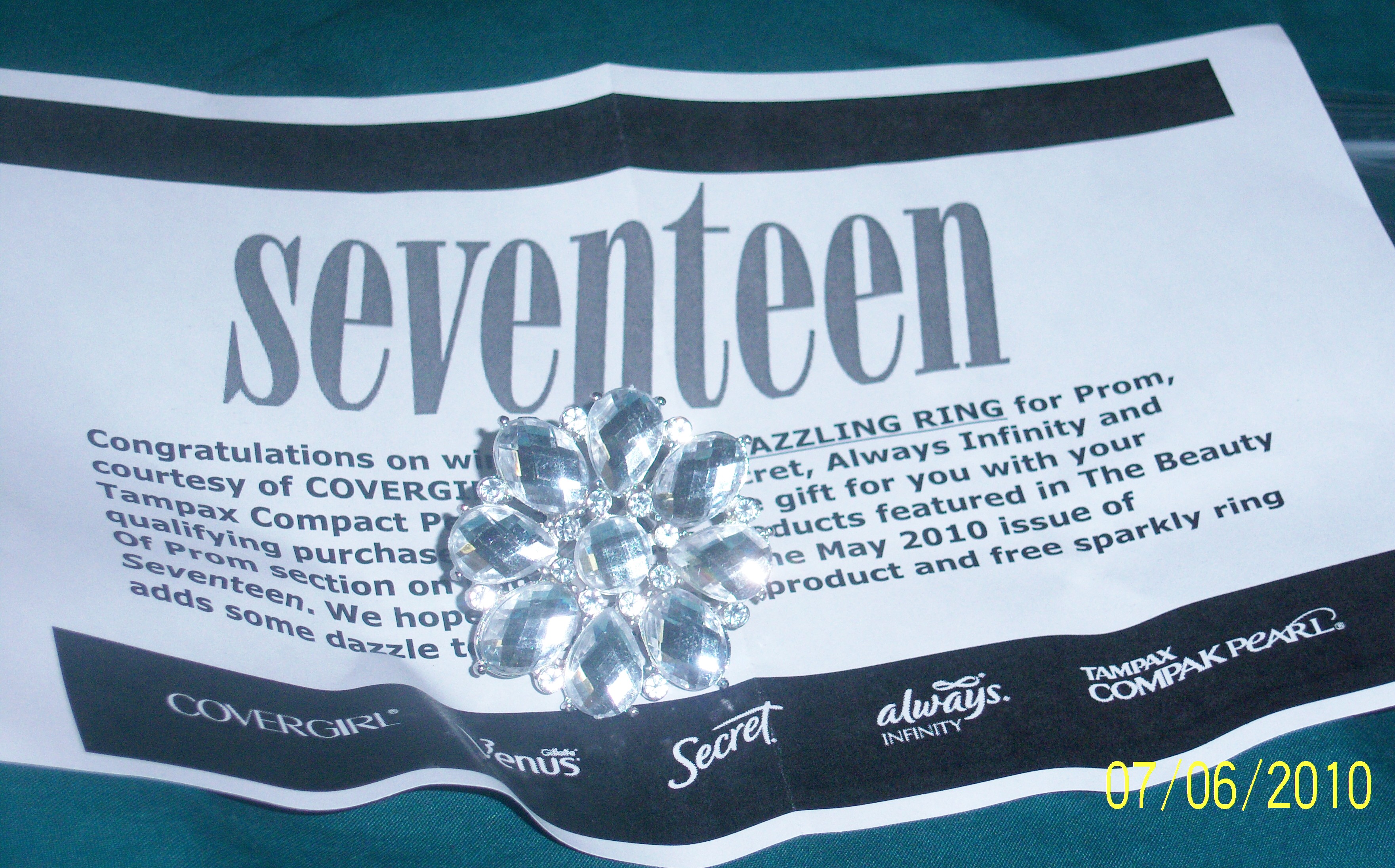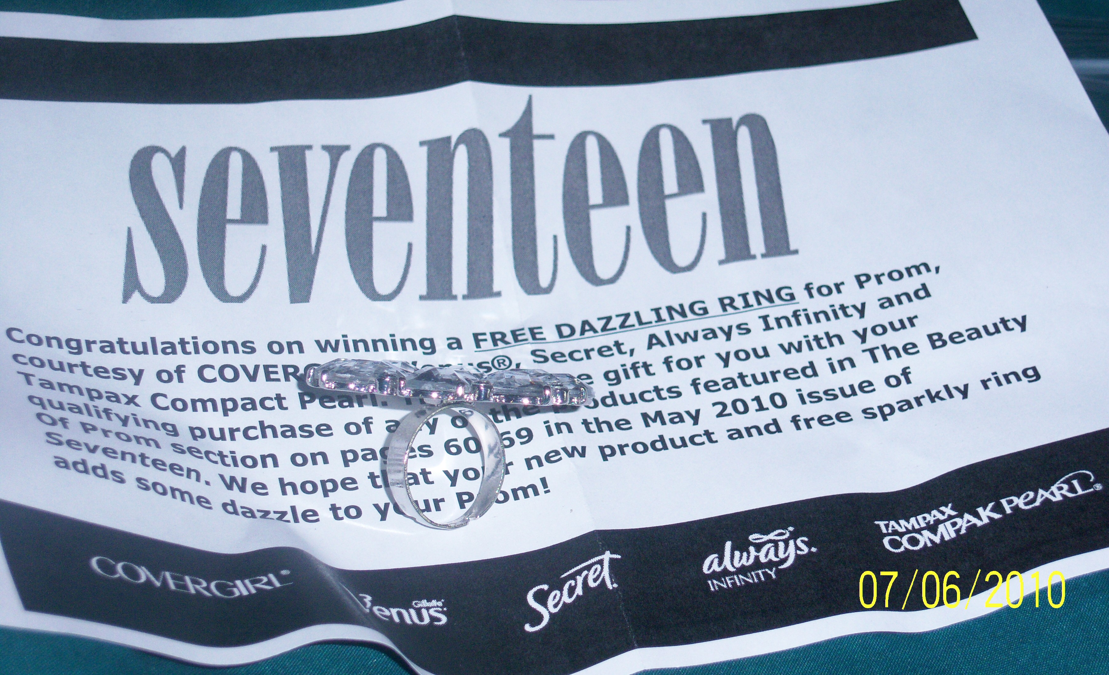 Congratulations on winning a free Dazzling ring from Prom, courtesy of Covergirl, Vanus, Scret, Always Infinity and Tampax Compact Pearl. This is a free gift for you with your qualifying purchase of any of the products featured in The Beauty of prom section on pages 60-69 in the May 2010 issue of Seventeen. We hope that your new product and free sparkly ring adds some dazzle to your prom! http://knuckeyimports.com/06/free-dazzling-ring-from-seventeen/