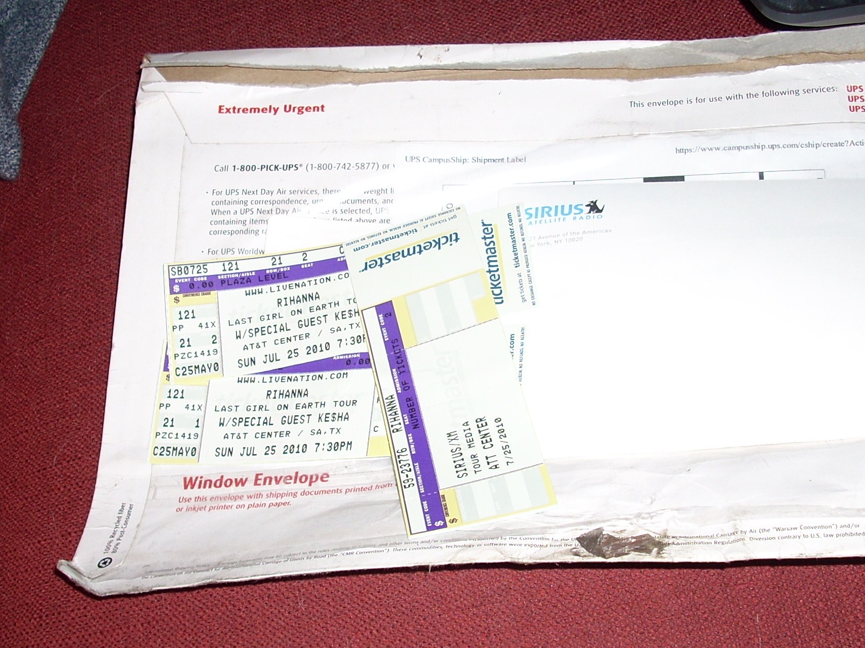 Last Friday I received a call from Sirius to verify my information and to inform me that I was a FIRST PRIZE WINNER in their Rihanna Last Girl on Earth Tour Concert Giveaway! After we spoke she emailed me the UPS tracking number – I just got the package today. I got 2 really FABULOUS tickets to go see RIHANNA and KESHA! Concert is next Sunday! HOORAY! Thank you SIRIUS!