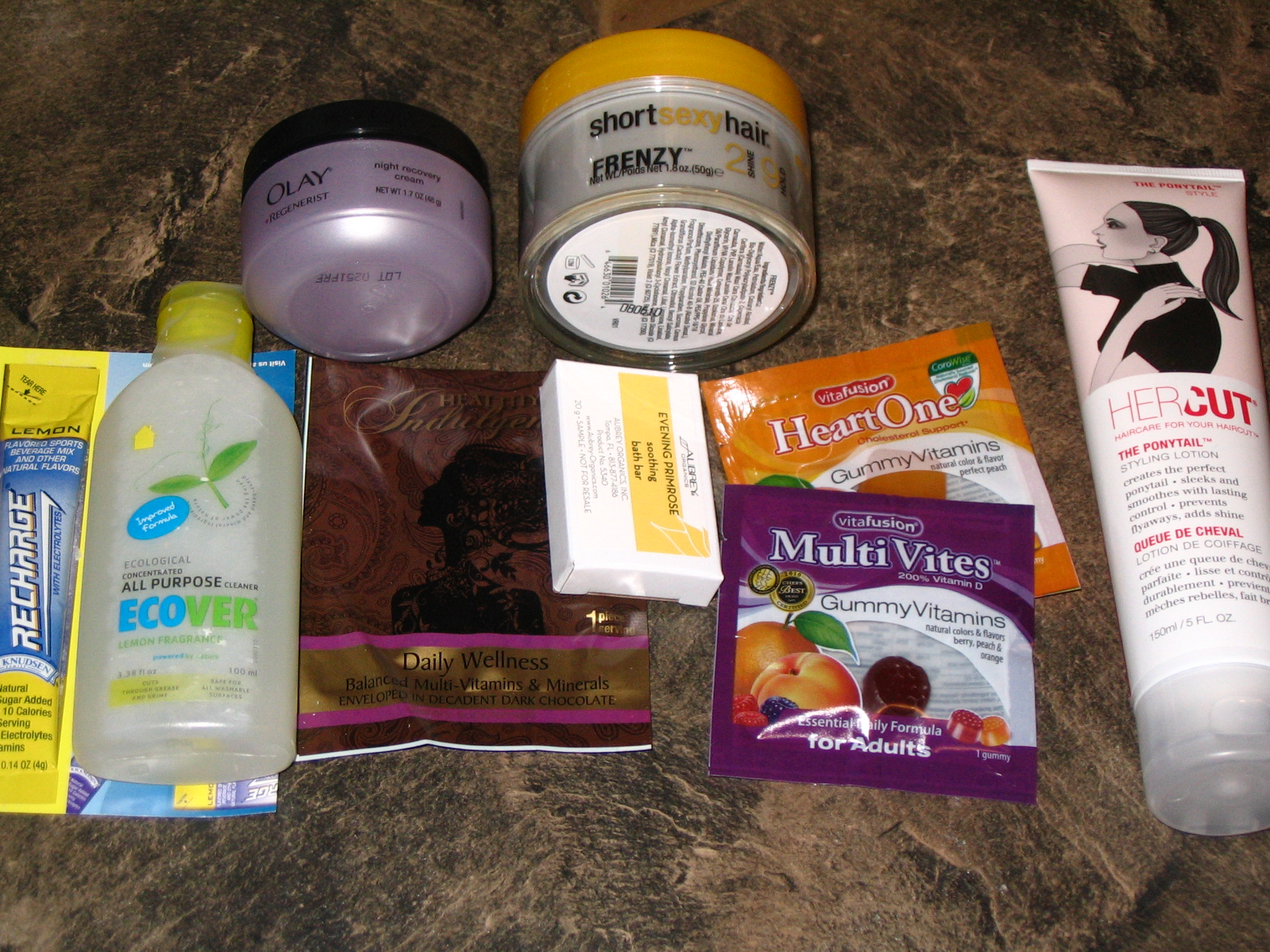 Pomegranate pomagram, 2 Allure wins (Olay Regenerist & HerCut Styling Lotion), Naturally Savvy samples, Vitafusion samples, Durex kit from Smile.ly 🙂