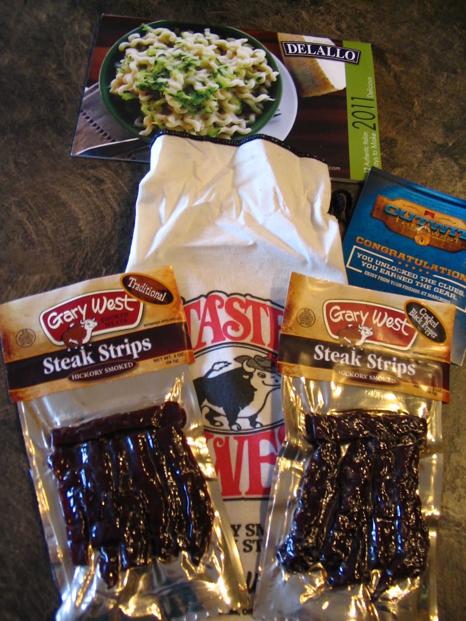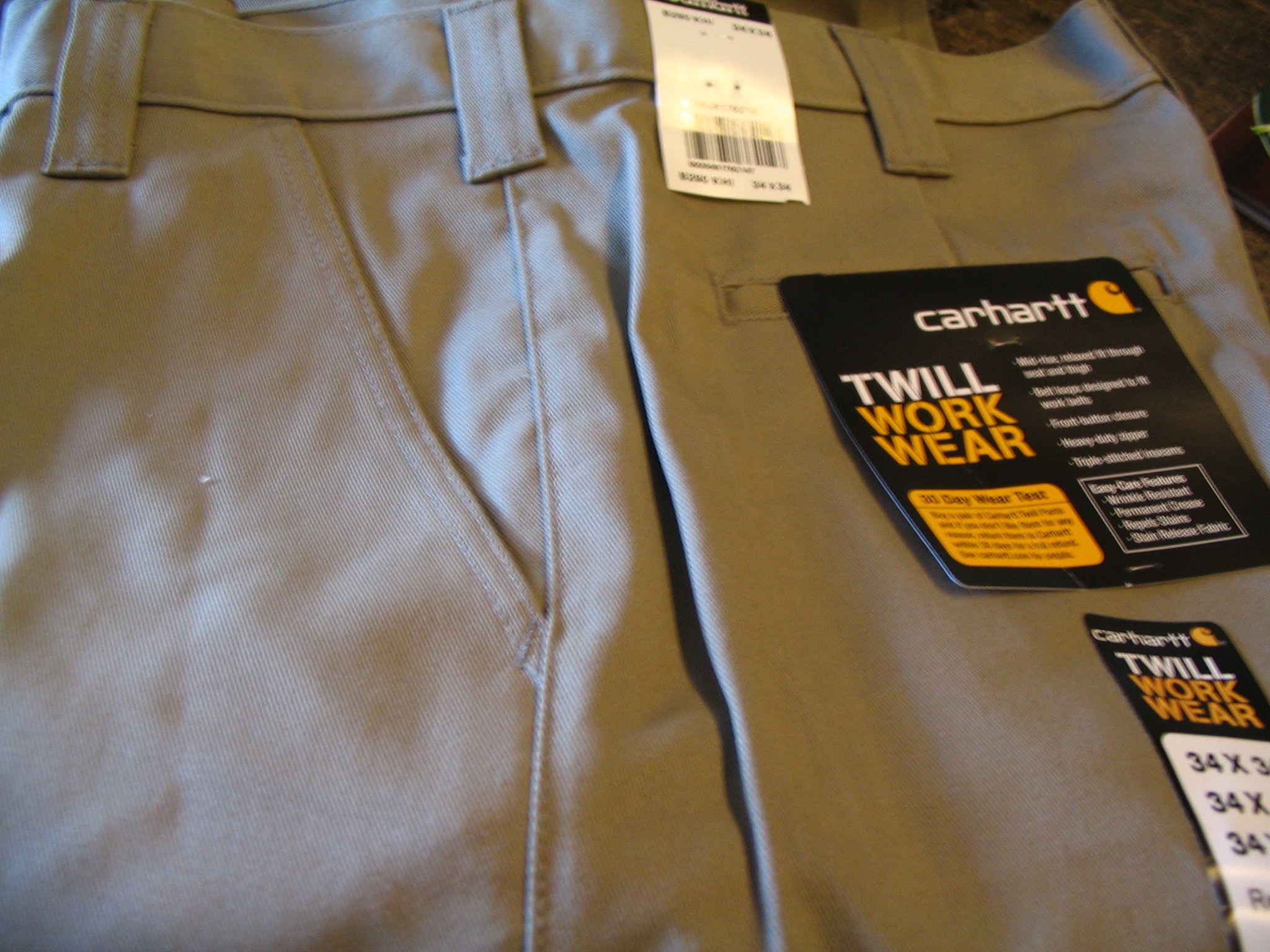 Carhartt twill pants from their IWG (exp.), beef jerky strips from Marlboro contest (exp.), Delallo calendar. Thanks Chris!