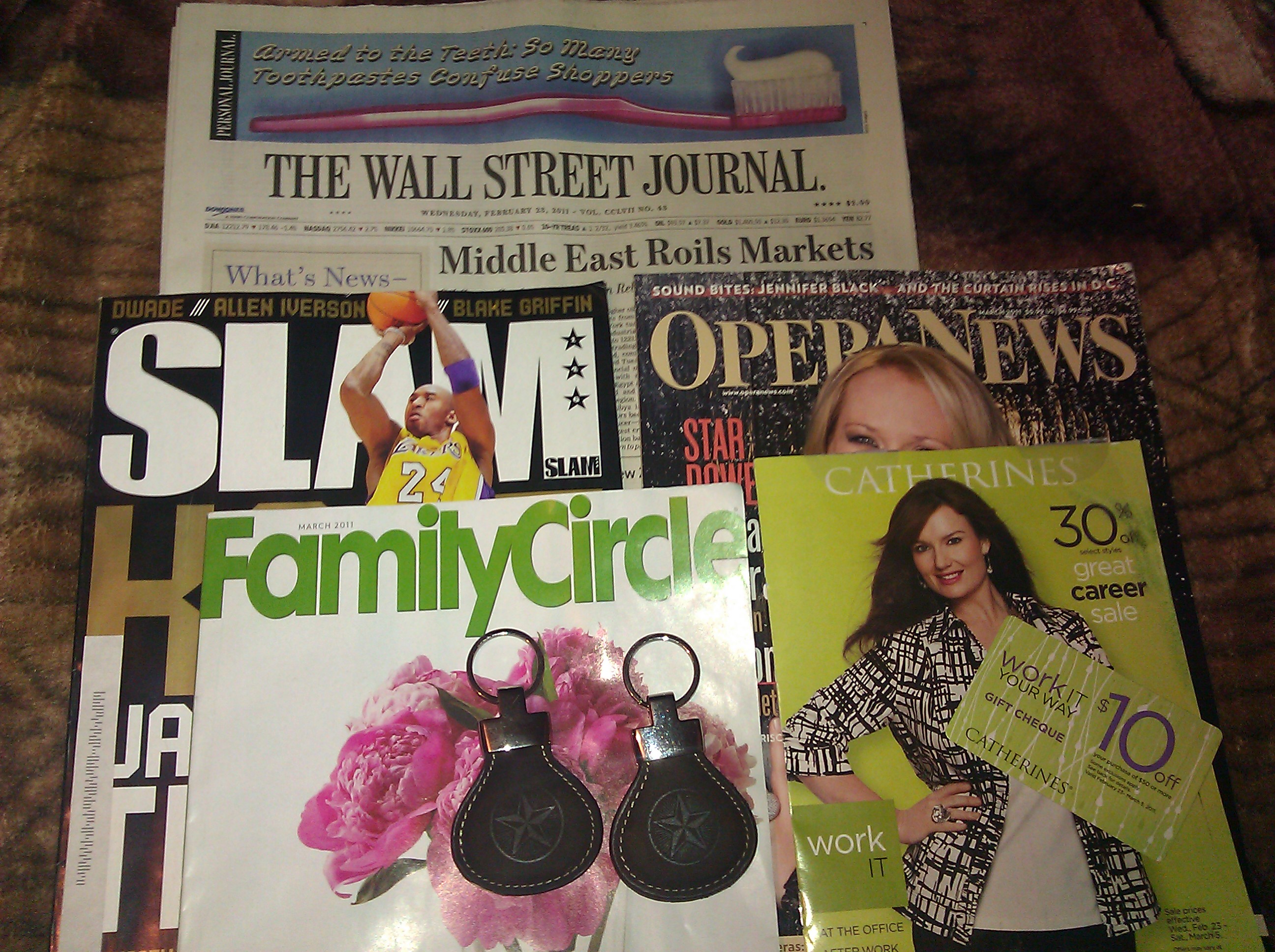 Free magazines: Marlin, Flex, Bloomberg Businessweek, Time, Garden Design, S.O.D, Prevention