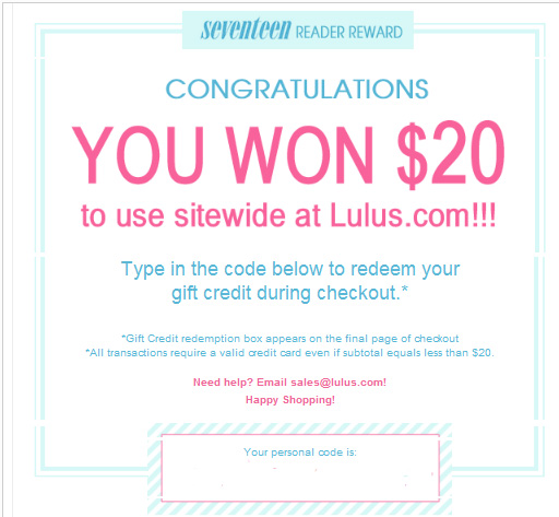 Got an email from seventeen magazine and said i won 20$ from the lulus.com shoe giveaway. 3000 winners 🙂 I ordered myself a cute pair of Sandals, shipping not included.