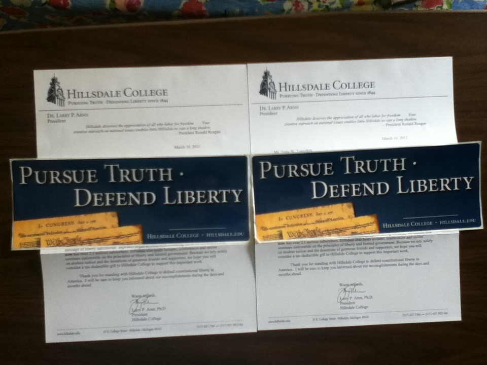 PURSUE TRUTH DEFEND LIBERTY BUMPER STICKERS FROM HILLSDALE COLLEGE