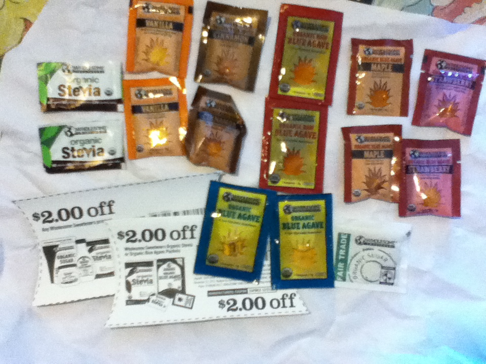 15 packets of sweeteners and four dollar in coupons from Wholesome Sweeteners
