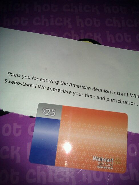 I got a letter and gift card today . It said Thank you for entering the American Reunion Instant Win Game & Sweepstakes! We appreciate your time and participation. Enclosed was a $25.00 gift card!