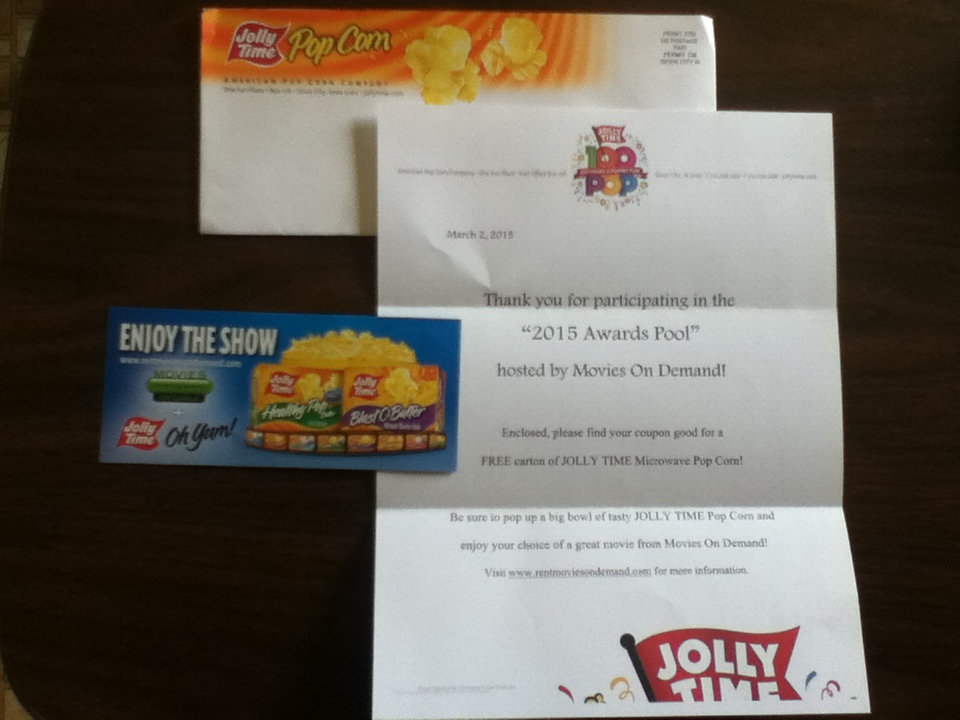 Coupon for a Free box of Jolly Time Microwave Pop Corn – for participating in the -2015 Awards Pool- hosted by Movies On Demand ! Thank you very much :)