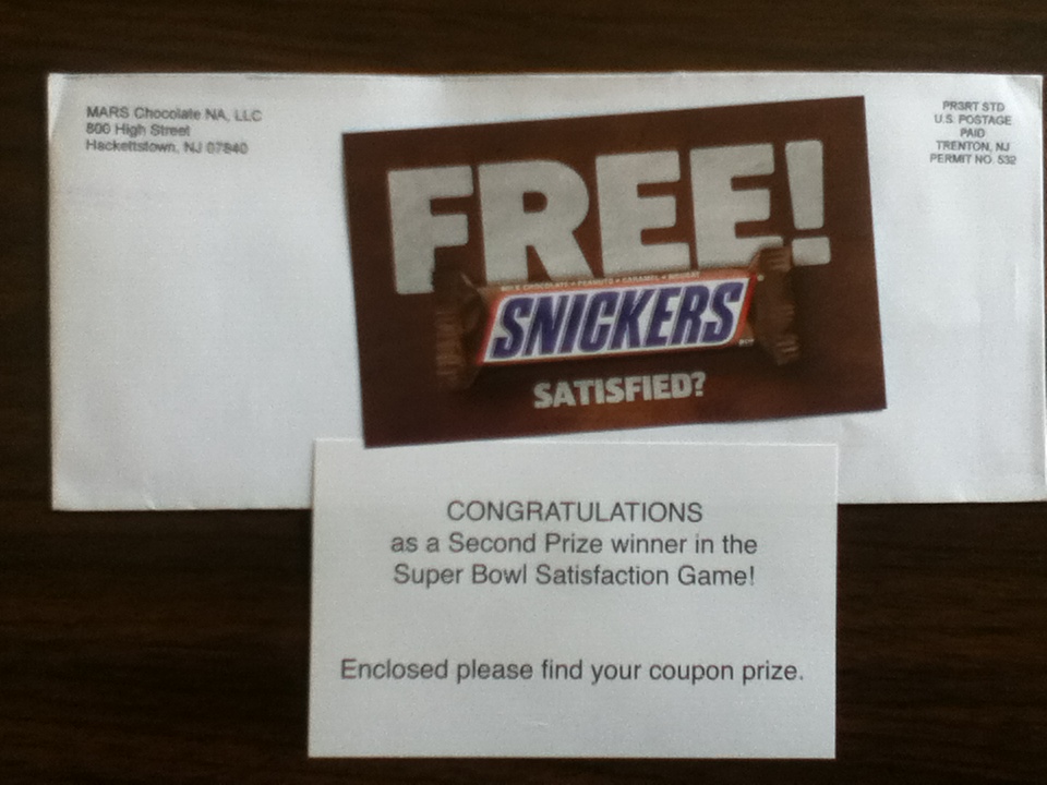 Second Prize Winner In The Super Bowl Satisfaction Game – Won a coupon for a Free SNICKERS Bar – Thank you very much MARS Chocolate