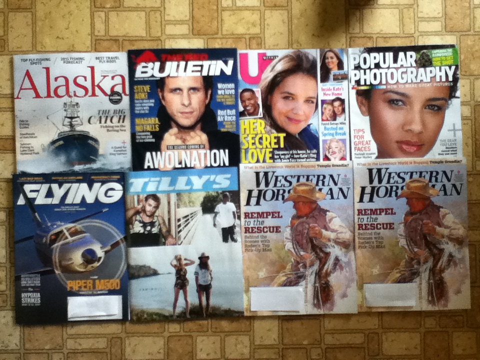 Alaska April magazine – The Red Bulletin April magazine – US Weekly – Popular Photography April magazine – Flying April magazine – Tilly’s Spring 2015 catalog – 2 Western Horseman April magazines
