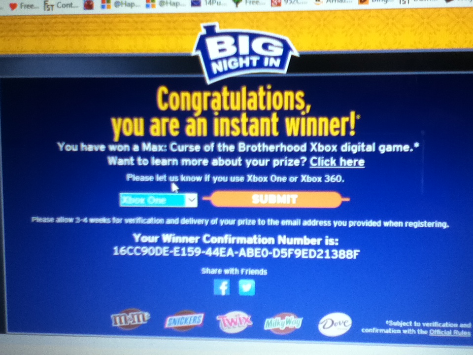 Instant Winner in The Big Night In Game Sweepstakes – Won a Max – Curse of the Brotherhood Xbox Digital Game – Thank you MARS Chocolate