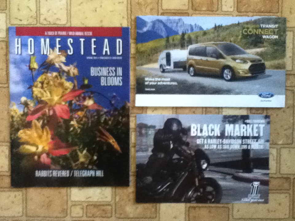 Homestead Spring 2015 magazine – The 2015 Transit Connect Wagon buying guide from Ford – Harley-Davidson postcard